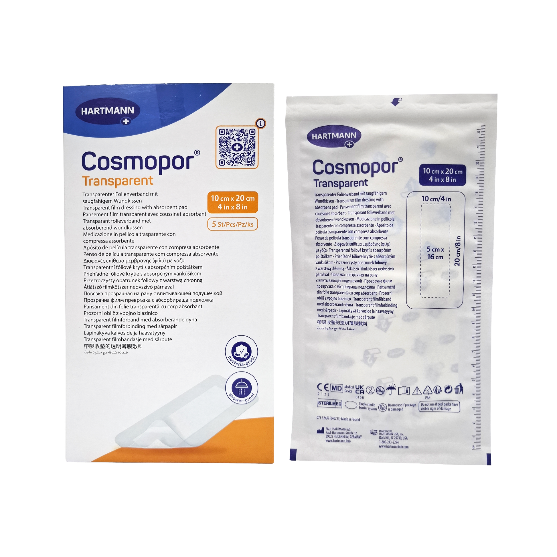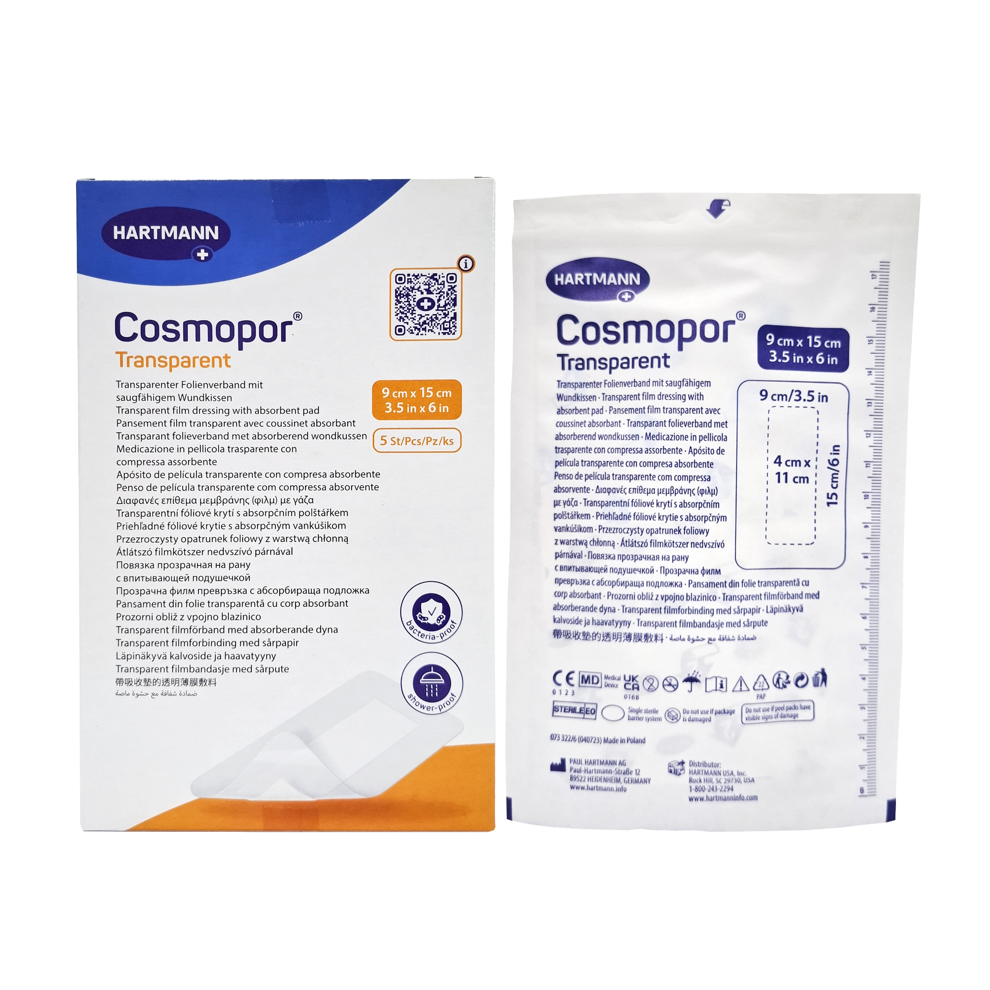 Cosmopor Transparent is a sterile, self-adhesive transparent film dressing with an absorbent wound pad, made of a semi-permeable, waterproof and transparent polyurethane film coated with a polyacrylate adhesive. The semipermeable polyurethane film is coated with a skin-friendly adhesive.