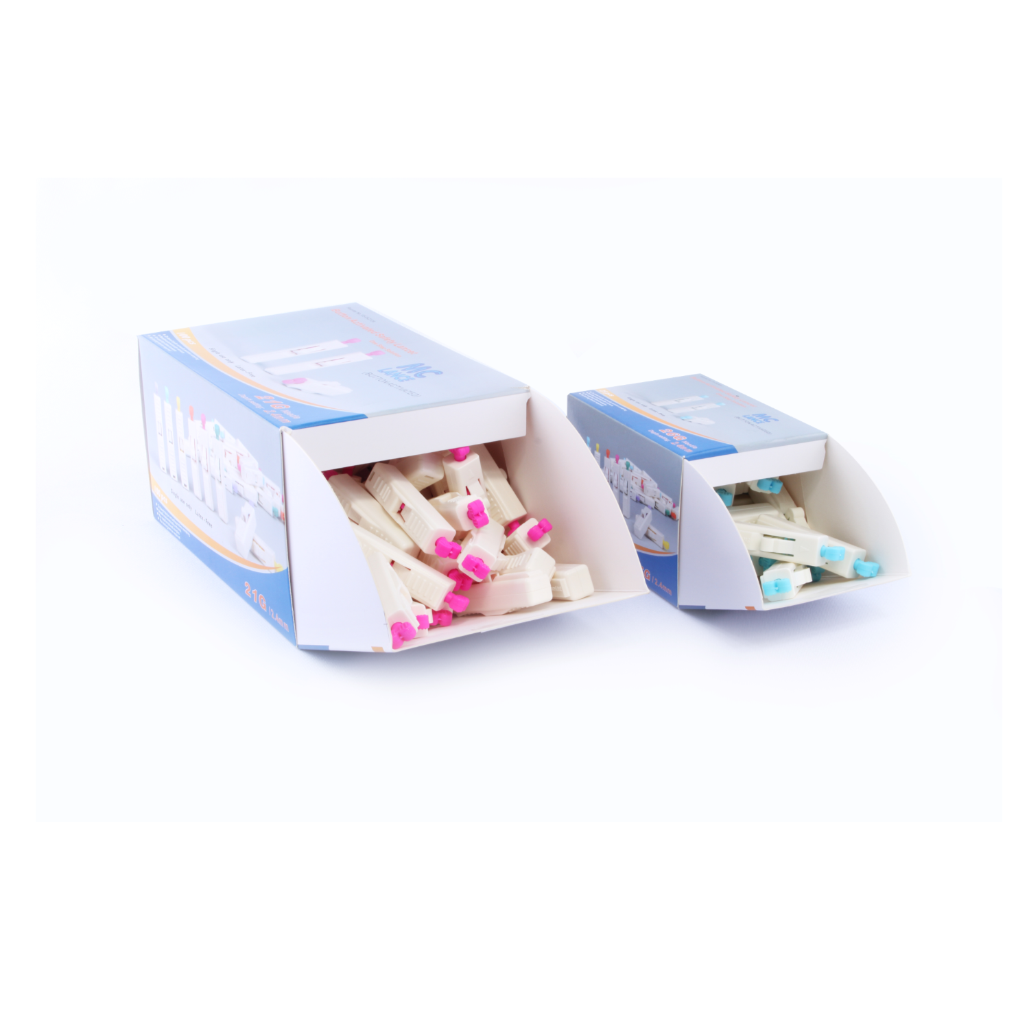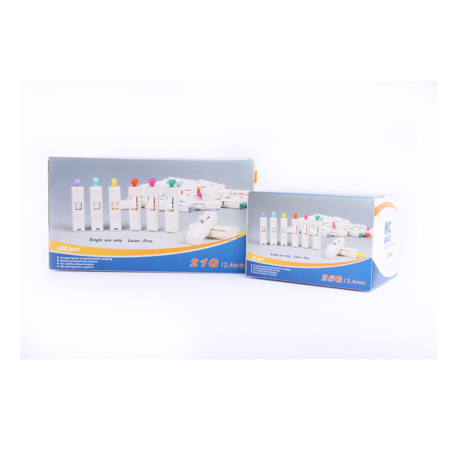 MC safety lancet is for single use. The Needle stylet is locked after usage, in order to avoid repeated use, protecting medical personnel and patients. Activated launching design brings simple operation as well as favorable blood collection. High quality and sharp tri-bevel design can pierce and retract quickly, reducing pain feeling. Various specifications of needle head and depth which can meet different requirement of blood draw volume and usages.
